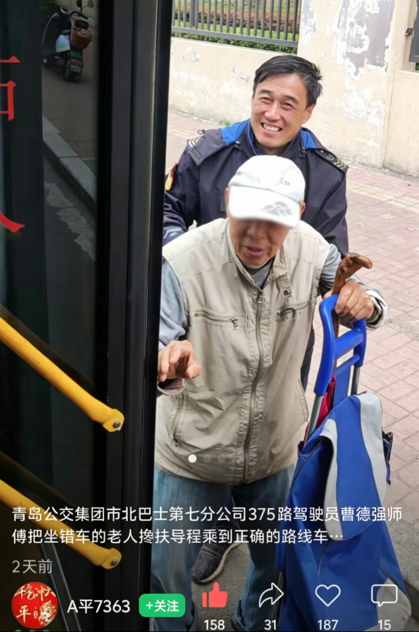 视频里,他耐心帮助一位坐反了方向的八旬老人,停好车、搀扶过马路、又叮嘱对向车司机帮忙照看。这段短短几分钟的日常举动,被乘客孙先生拍下后发到网上,很快收获了十万多次播放、五百多个点赞和一百多条暖心评论。网友们纷纷留言,想找到这位好心的司机。他就是青岛城运控股公交集团市北巴士第七分公司375路驾驶员曹德强。因为一个“曝光”视频,温暖了整座城市。