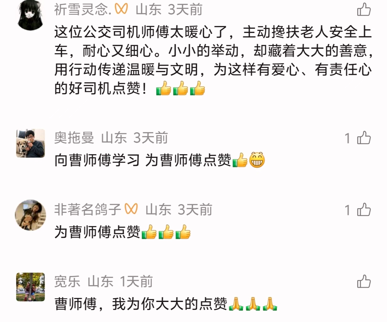 很多网友在评论里说,自己被这个视频打动了。有人说:“这才是真正的服务,不是嘴上说说。”有人说:“大爷遇到这样的司机,是他的福气。”还有人说:“希望找到这位司机,给他点个赞。”孙先生看到大家的反响,也想找到这位好心的司机当面感谢。根据热心公交司机提供的线索,孙先生得知这位好心的驾驶员是375路公交车的曹德强师傅,于是特意致电青岛公交集团市北巴士第七分公司转达网友们的赞扬。