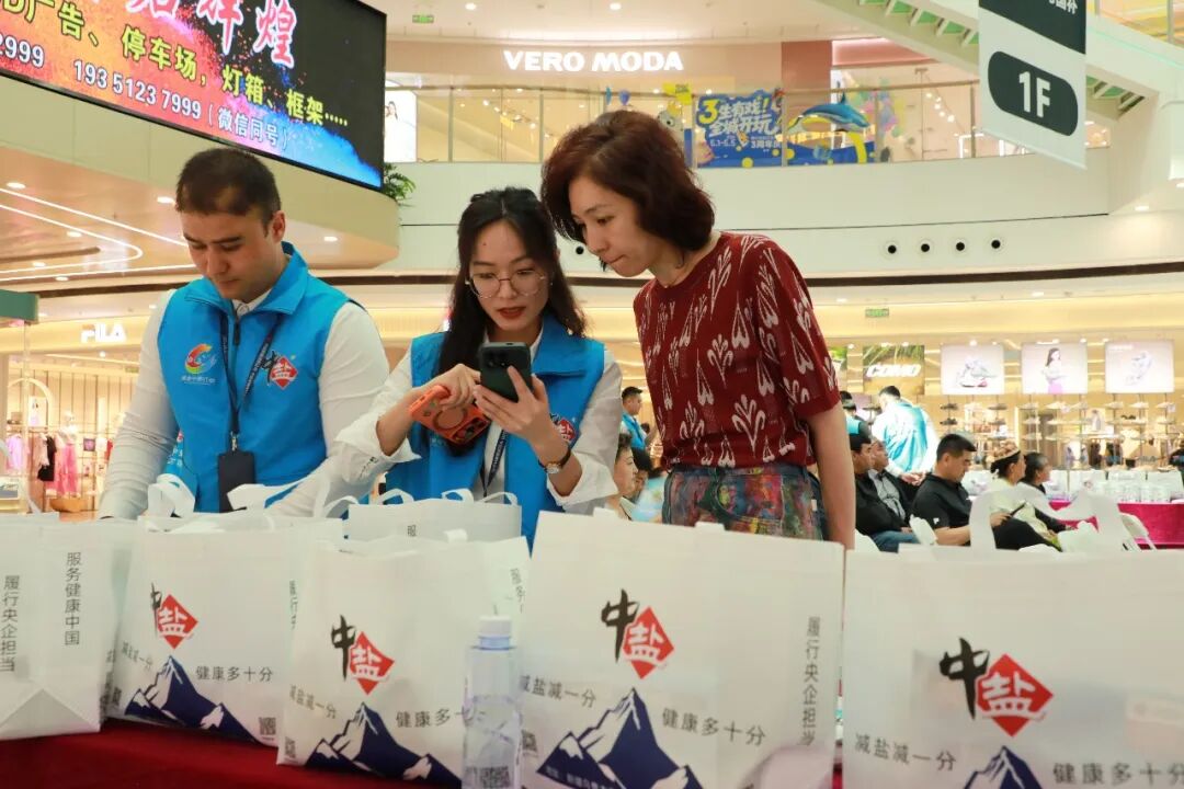 中盐新疆公司设置产品展示与互动体验区,推广低钠盐等健康用盐产品,现场发放减盐宣传资料及公益礼包,吸引众多市民参与。