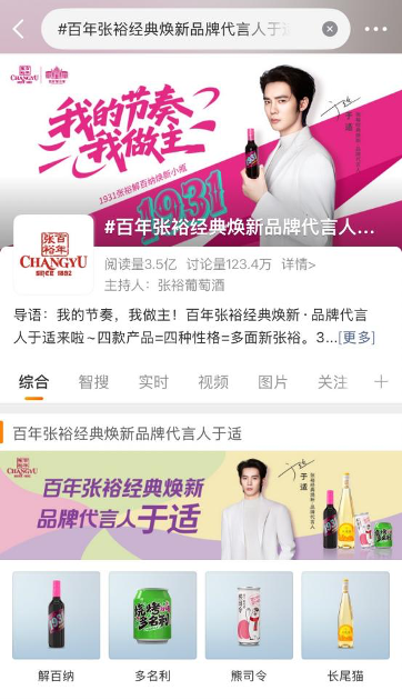 微博话题#百年张裕经典焕新品牌代言人于适#阅读量突破3.5亿,讨论量超122万,不少用户在评论区表示“终于有酒品牌愿意站在消费者的角度思考与表达”。