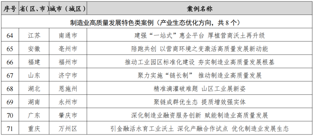 据了解,制造业高质量发展实践案例征集,围绕制造业高质量发展指标体系中的综合质效、结构优化、创新发展、数字赋能、绿色低碳、产业生态等六大维度,征集各地在政策支持、产业发展、企业培育、转型升级、环境优化等方面的探索实践、特色举措、取得成效及可复制推广的经验,主要包括综合质效提升、结构优化升级、创新发展驱动、数字赋能提质、绿色低碳转型、产业生态优化六个方面。全国共有71个案例上榜2025年制造业高质量发展实践案例名单,其中山东有6个案例入选。