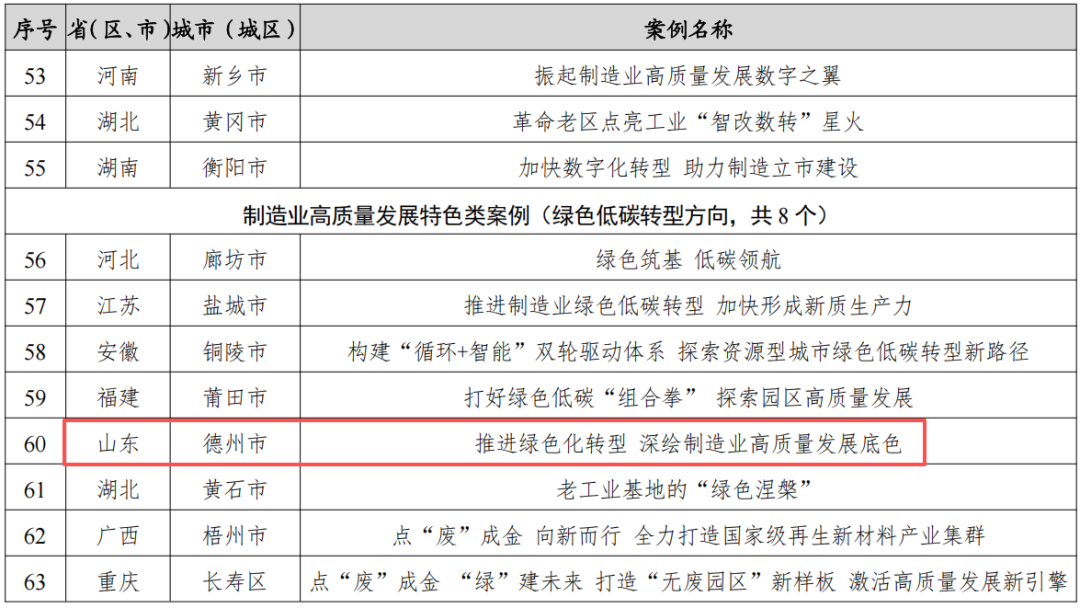 近日,工业和信息化部正式公布2025年制造业高质量发展实践案例名单。其中,“德州推进绿色化转型 深绘制造业高质量发展底色”实践做法入选制造业高质量发展特色类(绿色低碳转型方向)案例名单。