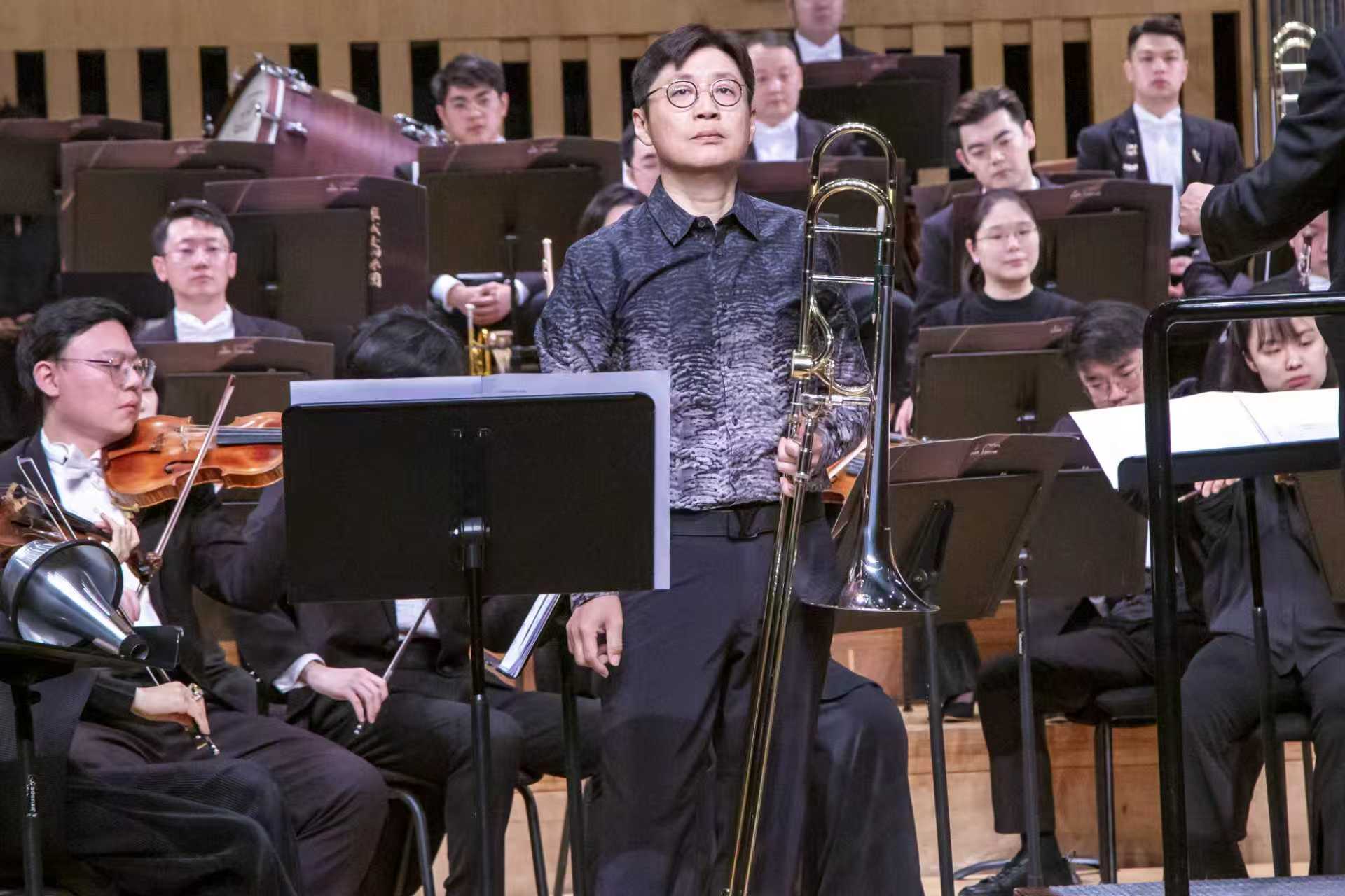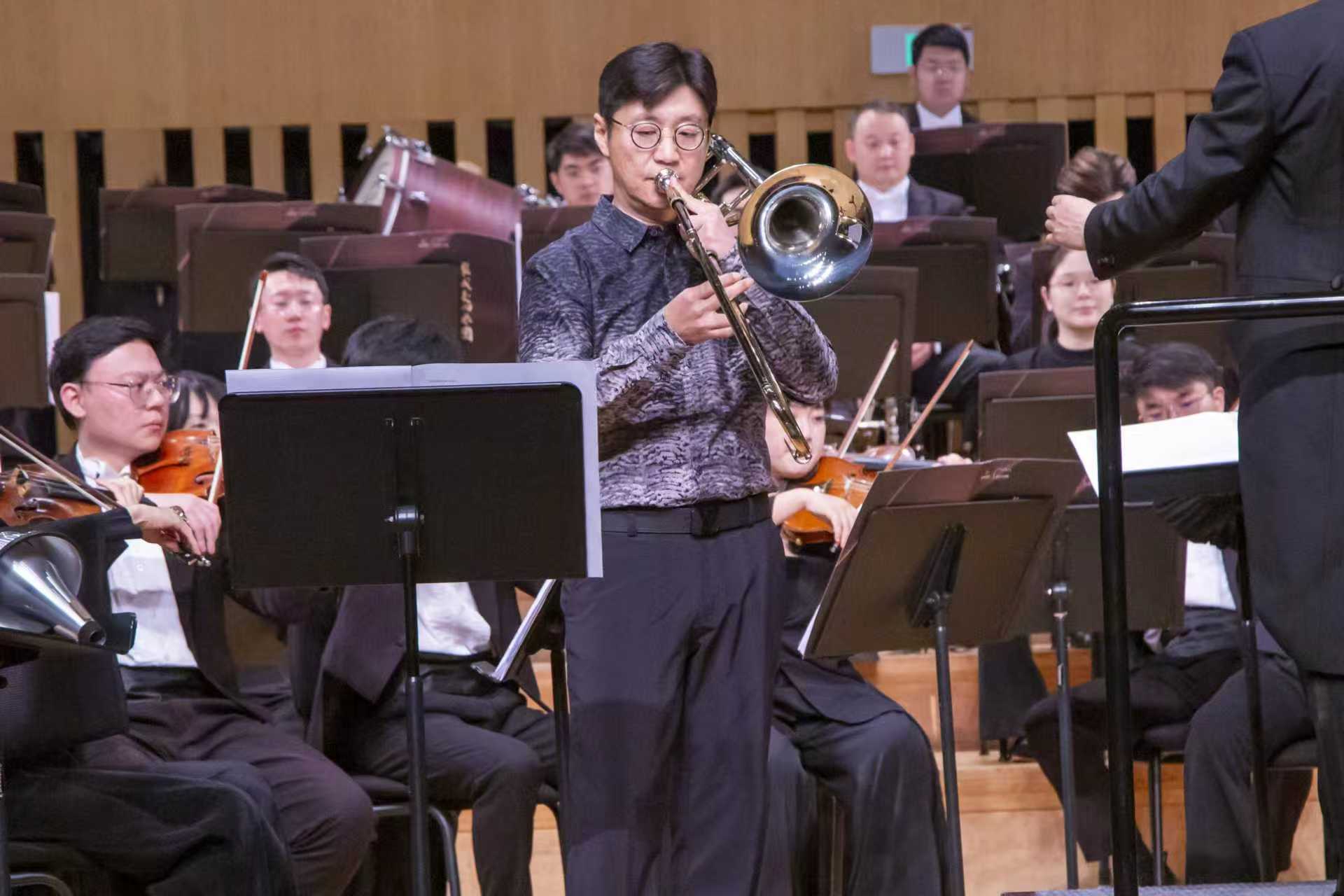 第二部作品由长号演奏家刘洋,携手指挥家杨力与泉城交响乐团,倾情演绎作曲家王培丞原创改编的长号协奏曲《罗密欧与朱丽叶》。该作改编自俄国作曲家彼得·伊里奇·柴科夫斯基(Peter Ilyich Tchaikovsky,1840—1893)的同名单乐章管弦乐曲,本次演出是长号与乐队版本的舞台首演。在刘洋教授的表演中,作为爱情悲剧独白者的长号以醇厚温润的独特音色,兼具细腻情感与充沛张力,将罗密欧与朱丽叶的旷世爱恋娓娓道来。乐曲伊始,长号独奏率先奏响肃穆的神父主题,旋律神圣典雅,又裹挟着宿命般的神秘感;随后乐队自然承接,共同烘托出庄严深沉的意境。呈示部中,激烈的家族宿仇主题陡然奏响,刘洋的演奏技巧精湛,吐音清晰利落、气势恢弘磅礴。转入优美的爱情主题后,长号表演又展现出浪漫婉转的抒情特质,打破了听众对这件乐器音色和表现力的刻板认知。展开部中,神父主题与宿仇主题激烈碰撞,相互交织,独奏与乐队配合默契,戏剧冲突感十足。尾声中,长号与乐队不再激烈角逐,彼此浑然相融。乐曲最终在庄严的神父主题与凄美绵长的爱情旋律中缓缓落幕,为这段爱情悲剧蒙上无尽的惆怅与哀思。