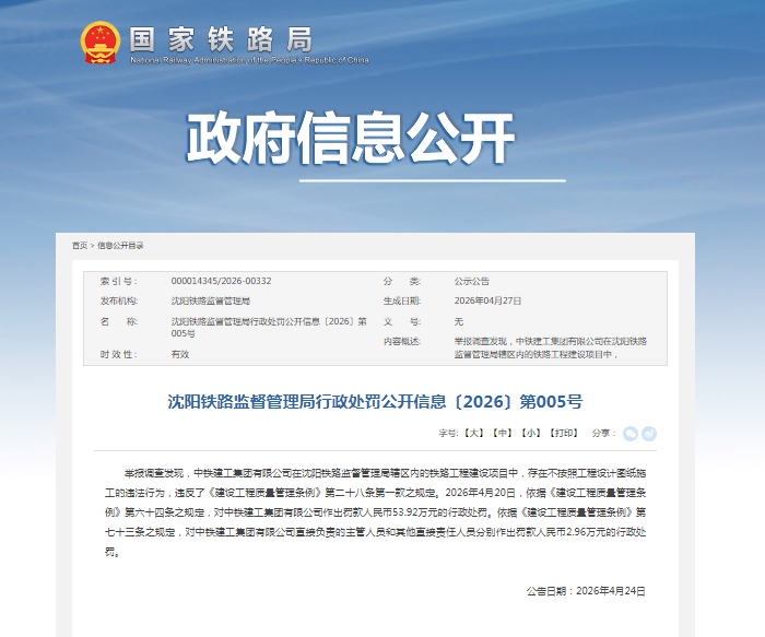 齐鲁晚报·齐鲁壹点记者于国家铁路局官网了解到,4月27日,其公示了沈阳铁路监督管理局行政处罚公开信息〔2026〕第005号。据悉,被行政处罚的单位为中国中铁(601390.SH/00390.HK)旗下的中铁建工集团有限公司(下称“中铁建工集团”)。