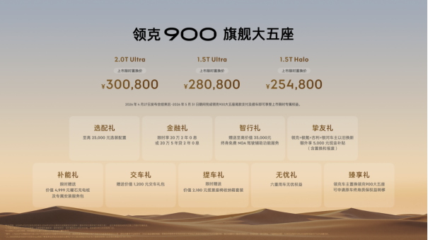 【4月27日,线上】领克汽车旗下全尺寸旗舰大五座SUV——领克900旗舰大五座正式上市。据悉,领克900旗舰大五座共推出 1.5THalo、1.5TUltra、2.0TUltra 三个版型,上市指导价29.98万元至34.58万元,上市限时置换价25.48万元至30.08万元。