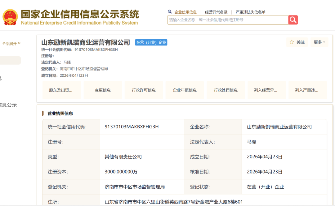 国家企业信用信息公示系统显示,山东励新凯瑞商业运营有限公司(下称“励新凯瑞”)近日成立,大股东高亚男为山东凯瑞企业管理咨询有限公司执行董事兼总经理,总经理为山东凯瑞商业集团有限责任公司(下称“凯瑞商业集团”)法定代表人赵孝国。