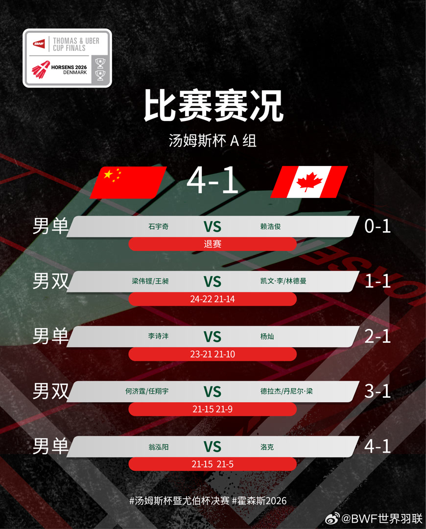第四盘,本届比赛首次上场的何济霆/任翔宇势如破竹,仅耗时26分钟便以21比15、21比9横扫德拉杰/丹尼尔·梁,为中国队锁定胜局。最后登场的翁泓阳也在个人“首秀”中大获全胜,以21比15、21比5完胜洛克。中国队以4比1击败加拿大队,提前晋级。