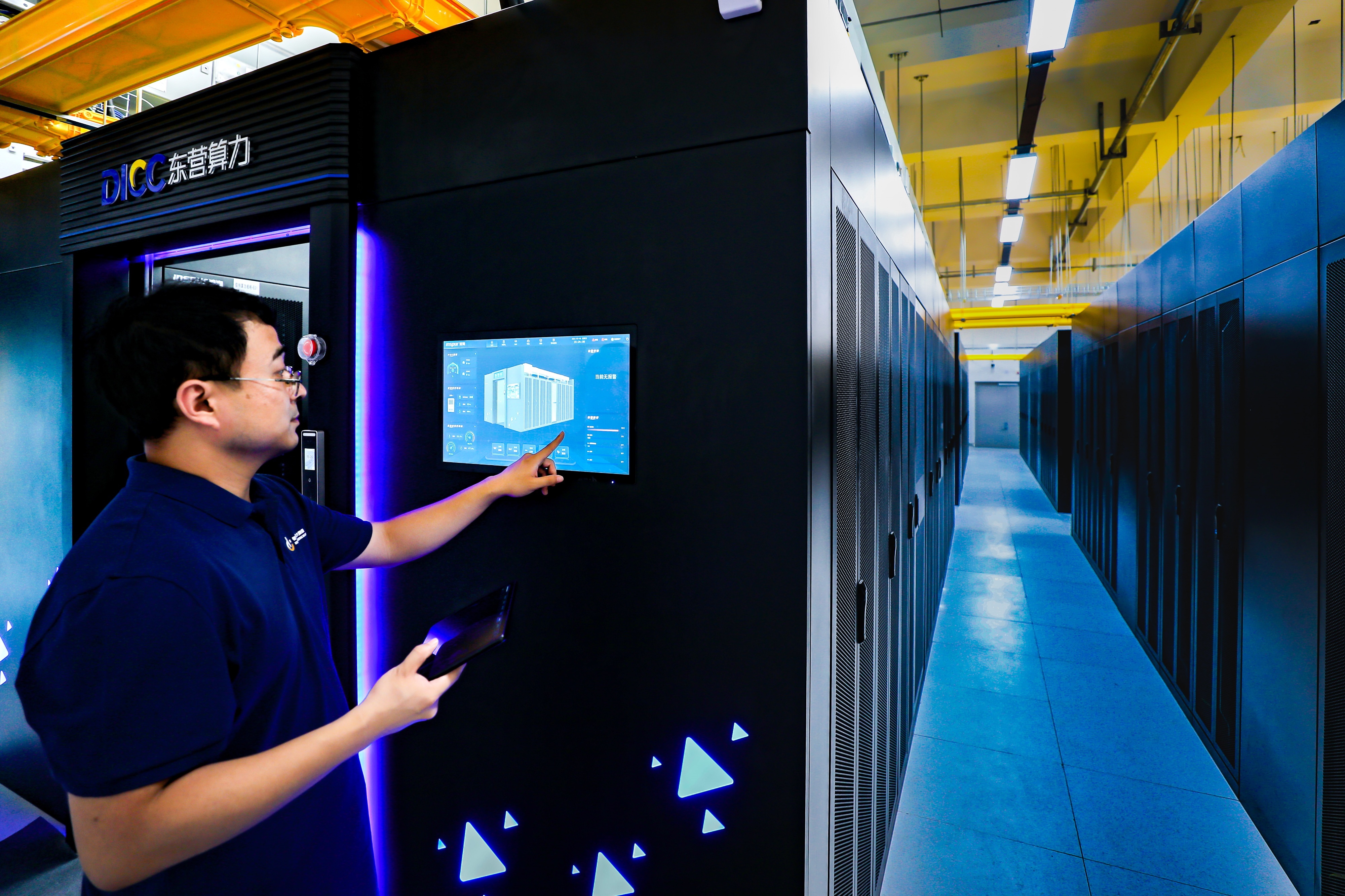 东营算力中心工作人员在检测数据运行机柜和处理器。(通讯员 缪宏伟)