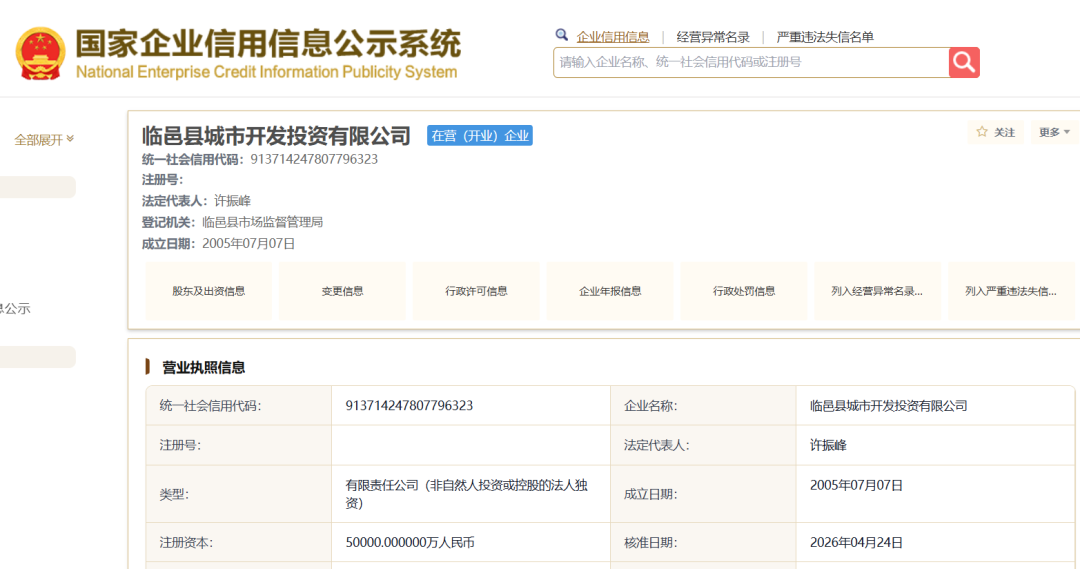 国家企业信用信息公示系统显示,近日,临邑县城市开发投资有限公司(下称“临邑城投”)发生人事变动,原法定代表人、董事、经理,变更为许振峰。