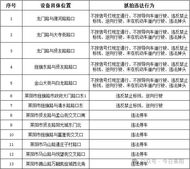 自公告之日起5日后,莱阳市公安局交通管理大队将严格按照《中华人民共和国道路交通安全法》等有关法律规定,依法进行管理,违反信号灯通行规定、不按所需行进方向驶入导向车道、不在机动车道内行驶、违反禁止标线指示、逆向行驶、违法调头、违法停车等违法行为将被系统自动抓拍。请广大交通参与者自觉遵守道路交通法律法规,共同维护良好的道路交通环境。