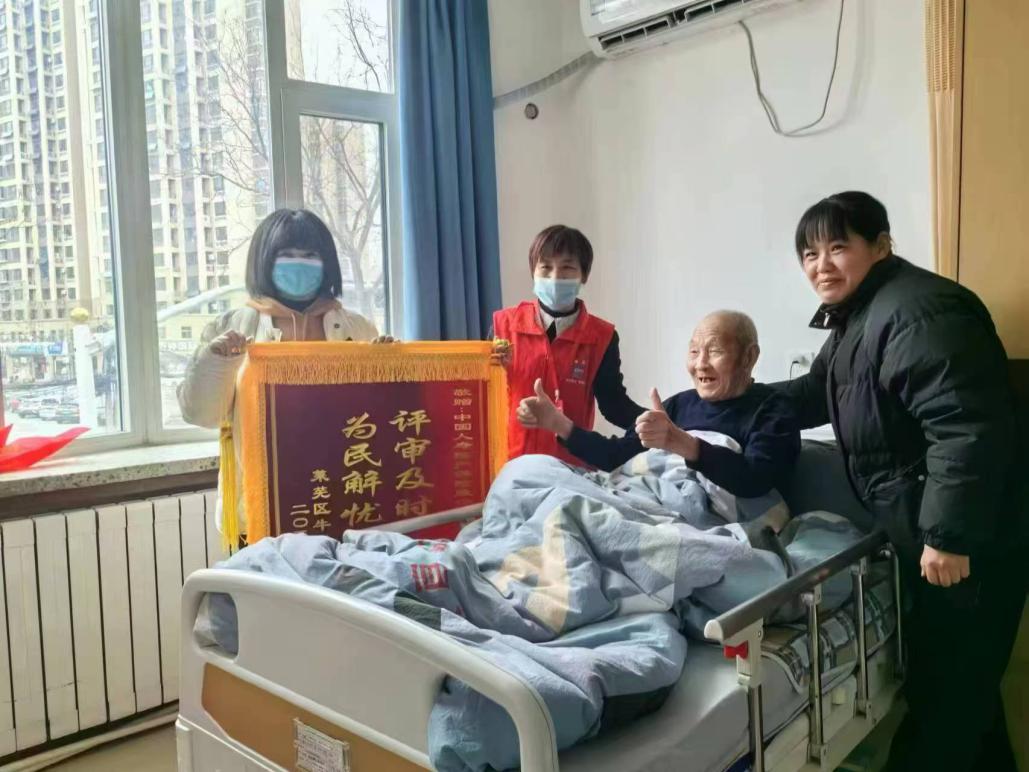 济南市莱芜区失能老人蔺发玉让家人专门制作送上“评审及时、业务精湛,为民解忧、情暖人间”的锦旗,并双手竖起大拇指。