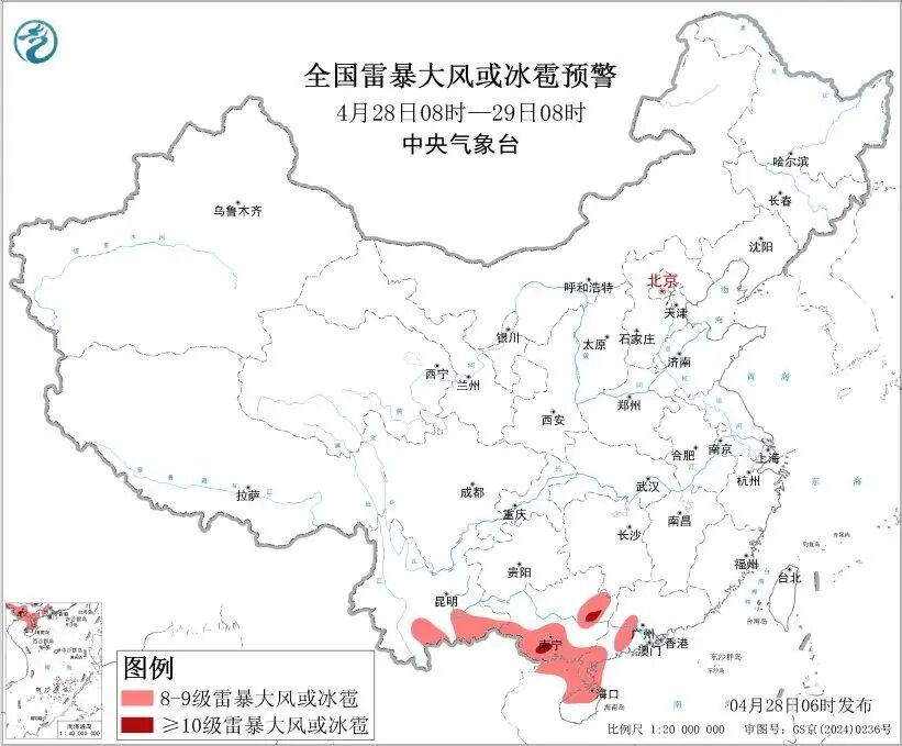 预计,4月28日8时至29日8时,重庆中部、云南东部、江淮南部、江南中西部、华南中西部等地部分地区有大到暴雨,其中,安徽南部、江西北部、广西东北部、广东西北部等地部分地区有大暴雨(100~130毫米)。上述部分地区伴有短时强降水(最大小时降雨量20~50毫米,局地可超过60毫米),局地有雷暴大风或冰雹等强对流天气。