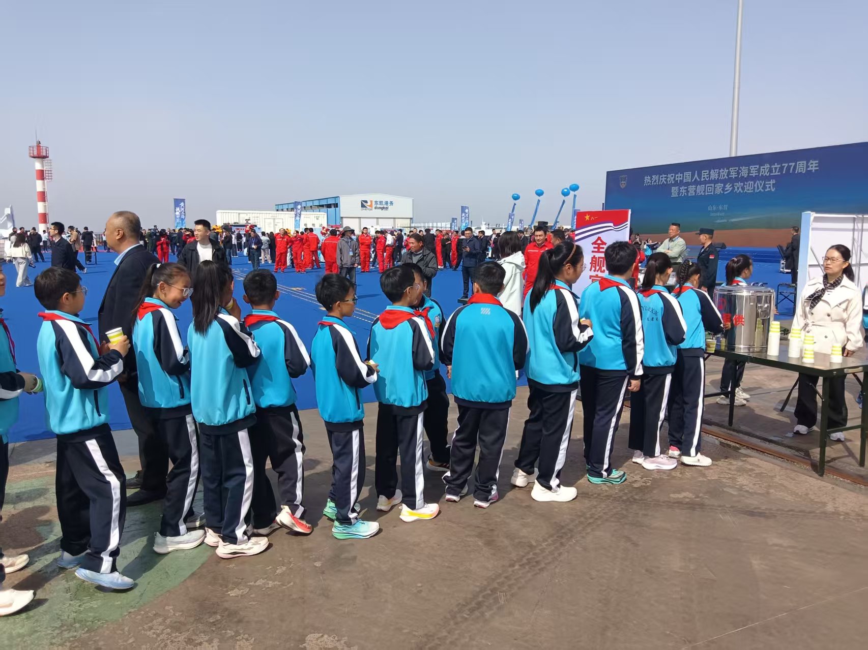 一大早,通往港口的道路上就已车水马龙。来自东营本地以及潍坊等周边城市的游客扶老携幼,慕名而来。人群中,有白发苍苍的老兵,有佩戴红领巾的少先队员,也有专程请假带孩子来接受国防教育的年轻父母。“能在家门口看到以咱们东营命名的军舰,太自豪了!”一位市民激动地说。