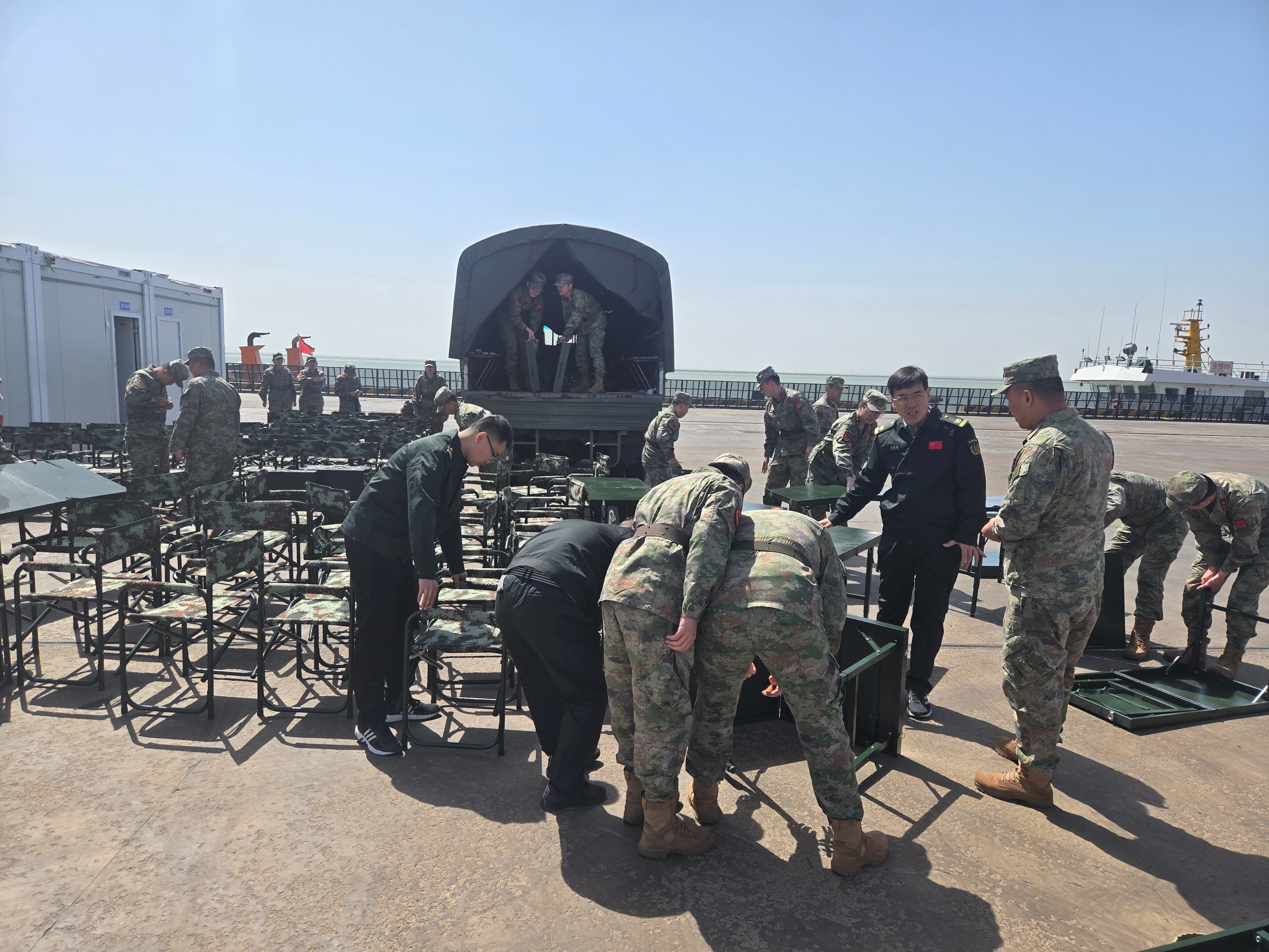在热闹的现场背后,东营市军供站的同志们早已忙碌了许久。活动筹备及开展期间,他们主动对接军分区战备建设处,协同搭建起5个临时板房——这些板房虽然简易,却成为了临时指挥、宣传报道的坚实“阵地”。同时,军供站协调配备专业通讯设备,全程参与现场秩序维护、安保巡查、入场检查等工作。为了让信号“满格”,他们还对接移动、联通等4家通讯单位,为安检区及港内提供全天候信号保障。