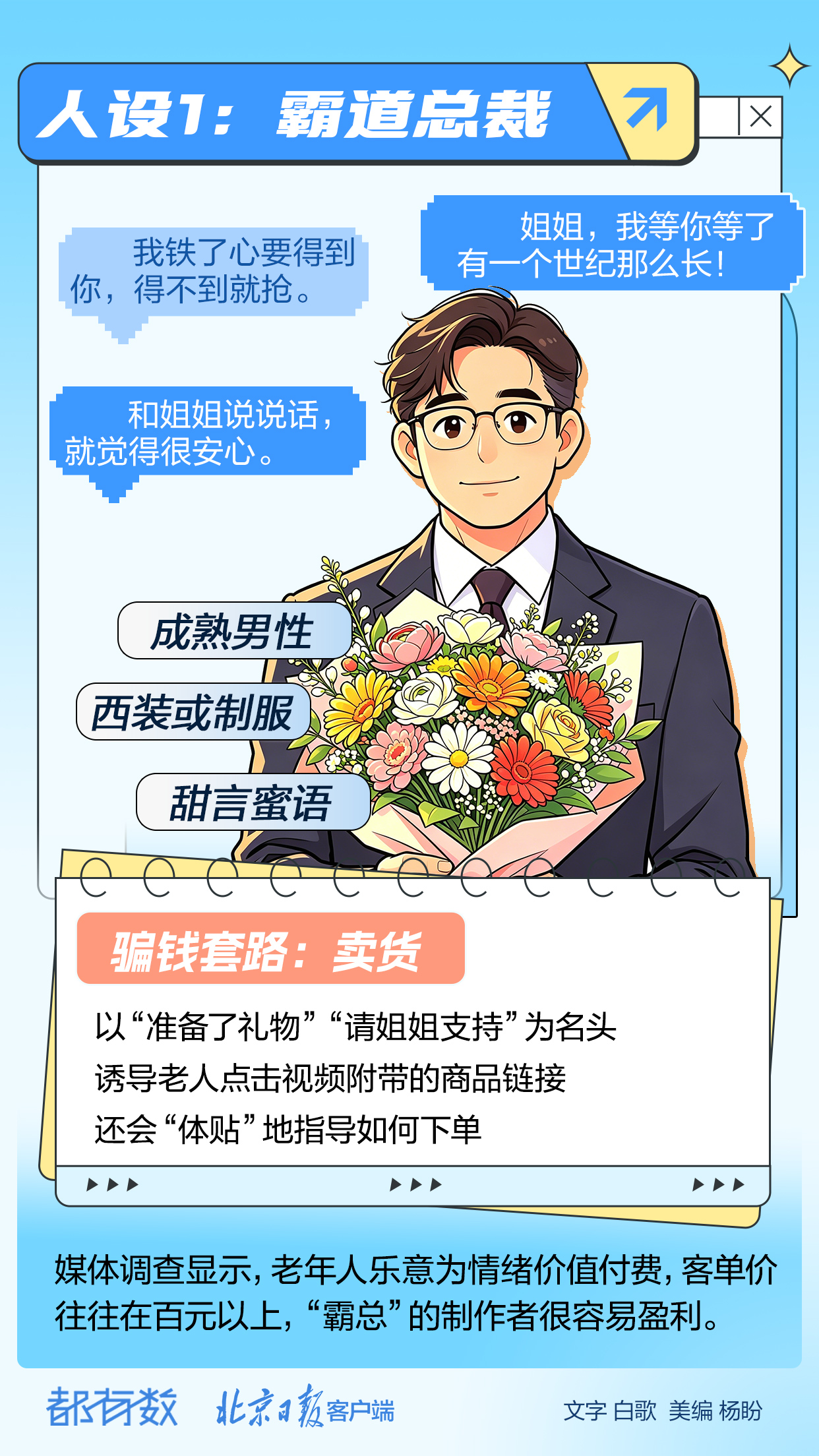 据央视新闻报道,近日短视频平台上的“AI霸总”正成为围猎老年人的最新人设——用AI生成的人物西装革履,张口“姐姐”、闭口“想你”,让屏幕外的老年人甘心为“霸总”代言的高价劣质商品买单。从自家儿孙到悲惨的陌生人,从专家到“霸总”,AI时代的诈骗往往从打造人设开始,与不同人设匹配的诈骗套路,您能否识破?