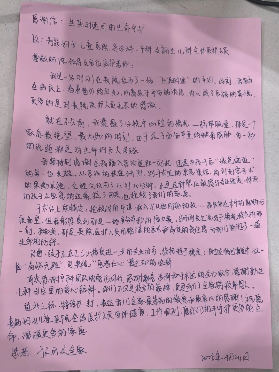 “那是一个家庭最绝望、最无助的时刻,每-秒的流逝都是对生命的巨大考验。我想特别感谢在我踏入急诊室那一刻起,迅速为我开启‘绿色通道’的每一位英雄。感谢产科团队的雷历风行,感谢急诊科和手术室的全力配合,感谢新生儿科对宝宝的悉心照料。”出院前,苗女士执意要来纸笔,亲手写下感谢信,字里行间满是真情实感。