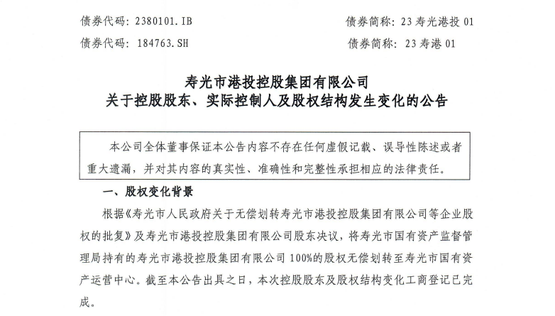4月27日,寿光市港投控股集团有限公司(下称“寿光港投控股”)发布公告称,根据《寿光市人民政府关于无偿划转寿光市港投控股集团有限公司等企业股权的批复》及寿光港投控股股东决议,将寿光市国有资产监督管理局持有的寿光港投控股100%股权无偿划转至寿光市国有资产运营中心。截至该公告出具之日,本次控股股东及股权结构变化工商登记已完成。