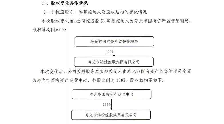 本次股权变化前,寿光港投控股的控股股东、实际控制人为寿光市国有资产监督管理局;本次划转后,公司控股股东及实际控制人由寿光市国有资产监督管理局变更为寿光市国有资产运营中心,控股比例为100%。