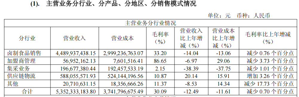 主营业务分行业来看,2025年,绝味食品的各项业务中,仅供应链物流营业收入上升,同比增长20.14%。其他业务均出现不同程度的下滑,其中集采业务下滑幅度最大为38.39%。占营业收入八成以上的卤制食品销售的营业收入下滑14.04%。