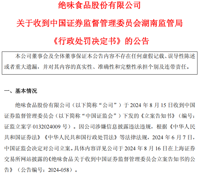 2025年9月30日,绝味食品发布公告显示,于2024年8月15日收到中国证券监督管理委员会下发的《立案告知书》(编号:证监立案字 0132024009 号)。因公司涉嫌信息披露违法违规,2024年6月7日,中国证监会决定对公司立案。2025年9月19日收到中国证券监督管理委员会湖南监管局下发的《行政处罚事先告知书》。2025年9月30日,公司收到中国证券监督管理委员会湖南监管局下发的《行政处罚决定书》(〔2025〕14 号),2017年至2021年期间,绝味食品未确认加盟门店装修业务收入,导致年度报告少计营业收入,占对应年度公开披露营业收入的比例分别为5.48%、3.79%、2.20%、2.39%、1.64%。公司2017年至2021年各年年度报告未如实披露营业收入。中国证券监督管理委员会湖南监管局对绝味食品股份有限公司责令改正,给予警告,并处以400万元罚款;对戴文军给予警告,并处以200万元罚款;对彭才刚给予警告,并处以150万元罚款;对彭刚毅给予警告,并处以100万元罚款。
