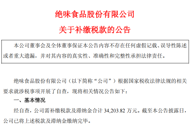 今年4月4日,绝味食品发布《关于补缴税款的公告》,公告显示,经自查,公司需补缴税款及滞纳金合计34203.82万元。截至公告披露日,公司已将上述税款及滞纳金缴纳完毕。上述补缴的税款及滞纳金将计入公司2025年及2026年当期损益。