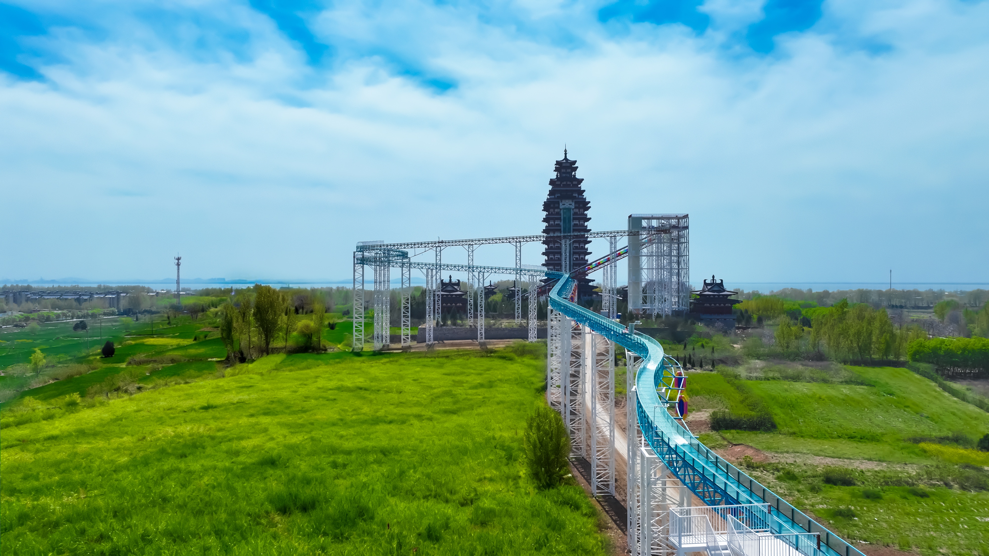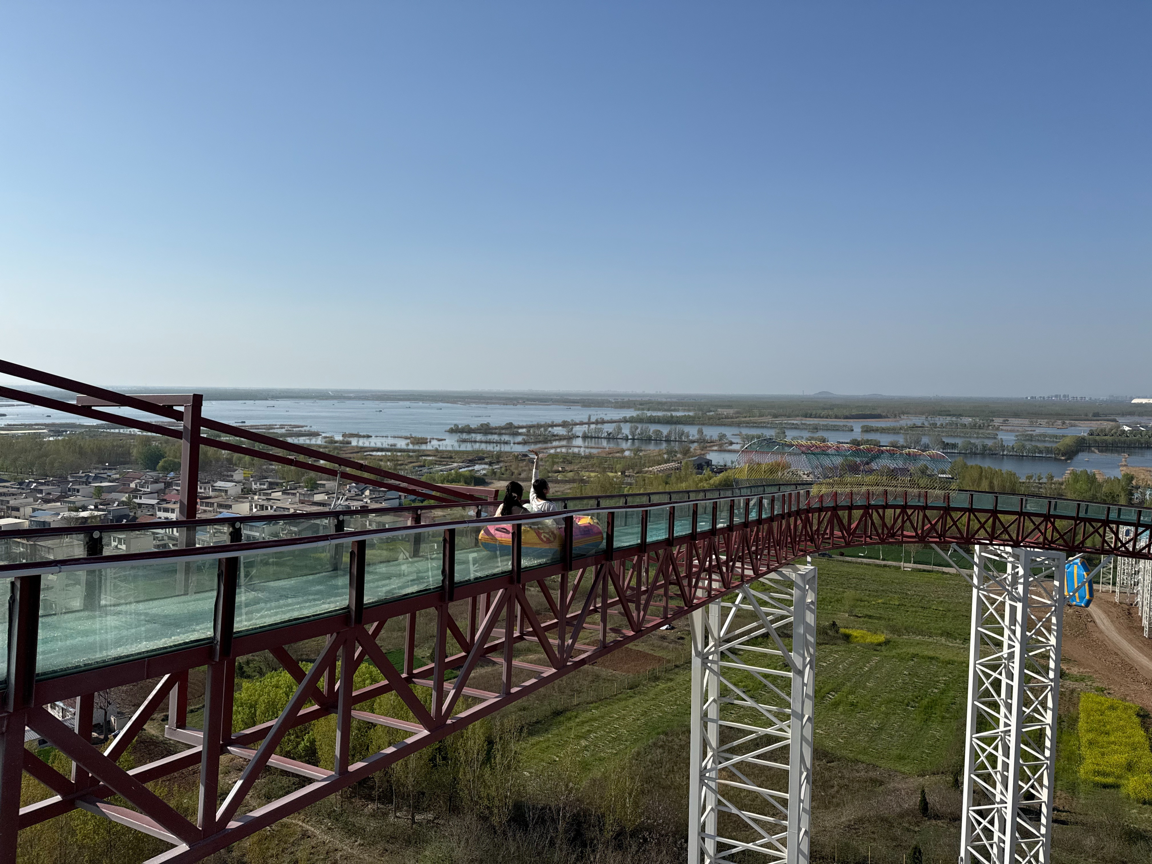 穿过微子文化苑的红墙黛瓦,望湖阁北侧的高空观景台已聚集不少游客。200㎡的平台凌空高悬,360°全景视野让微山湖的壮阔尽收眼底:远处碧波浩渺,船只如星点散落,滑道尽头的生态荷园已然绿意盎然。工作人员介绍,这条全长950米的玻璃滑道,巧妙串联起望湖阁与生态荷园两大地标,采用多层钢化夹胶玻璃打造,防滑槽、防撞护边等多重防护设施让安全无忧。