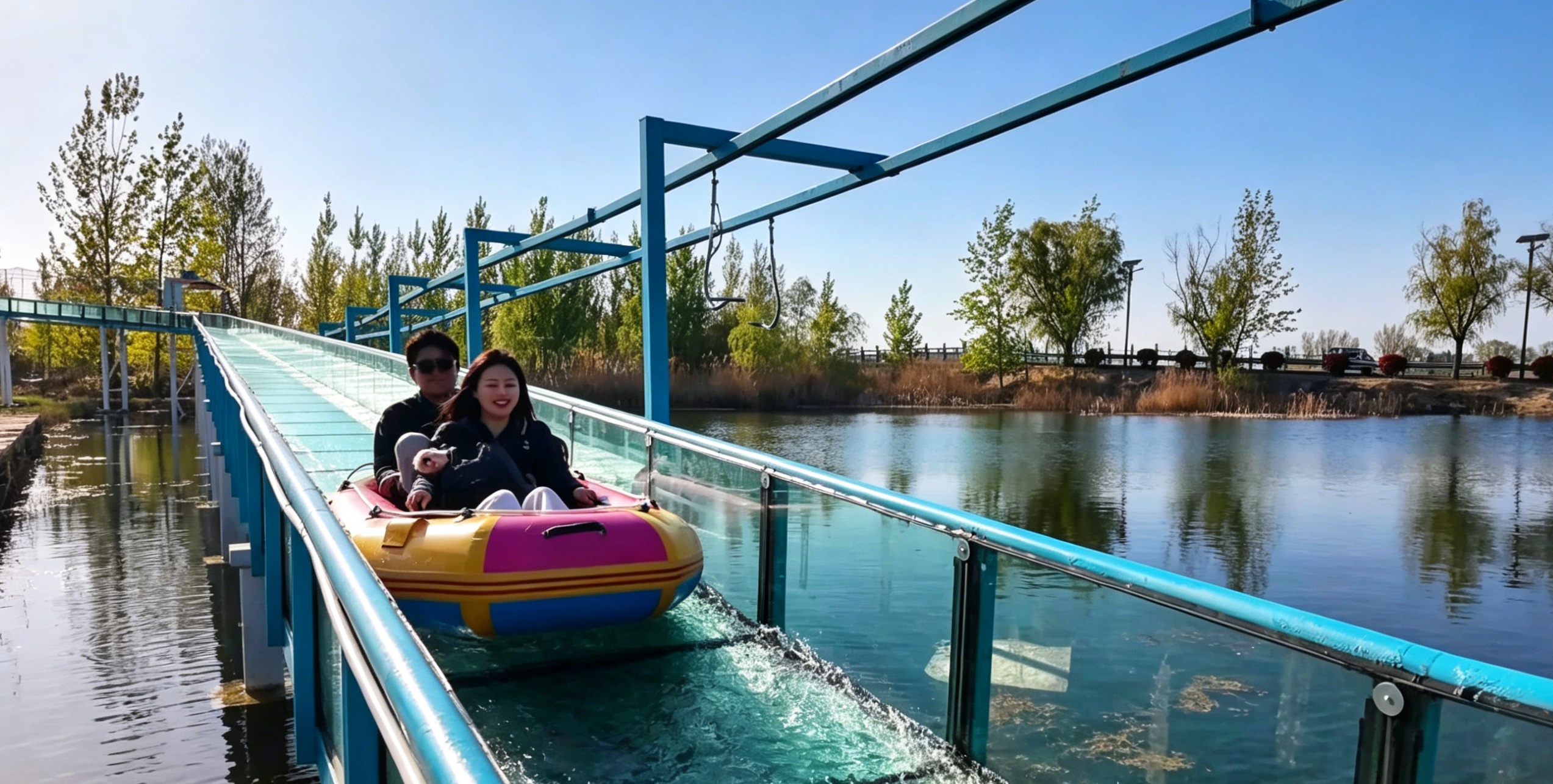坐上皮筏艇、抓紧安全扣,随着工作人员轻轻一推,我的“御风之旅”正式开启。瞬间的失重感让我忍不住惊呼,随即被迎面而来的清风抚平了紧张。滑道设计精妙,S弯与缓漂段交替出现,时而急冲而下,时而悠然滑行,风穿过耳畔的凉意格外舒爽。低头是透明玻璃下飞速掠过的绿植,抬头是万里无云的湛蓝天空,远处偶有白鹭掠过水面,构成一幅流动的生态画卷,这种“上揽天光、下瞰湖色”的双重体验,是传统观景方式难以给予的震撼。