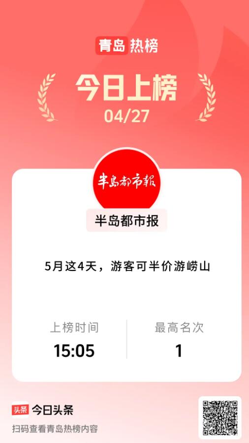 过去24小时内半岛都市报头条号这些作品登上平台热榜↓↓↓稿件《5月这4天,游客可半价游崂山》登上青岛热榜,最高名次为第一名https://www.toutiao.com/article/7633296265920447018/