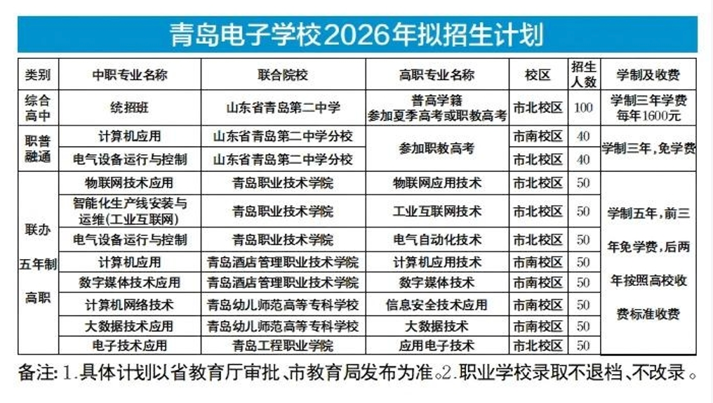 作为教育部首批认定的国家级重点职业学校、全国教育系统先进集体,青岛电子学校始终秉持“成就一个学生,幸福一个家庭,奉献整个社会”办学理念,深耕职业教育沃土,孵化数智赋能、多元成才、可持续发展的“电子生态”,以专业与温度铺就学子技能报国、人生出彩的进阶之路。