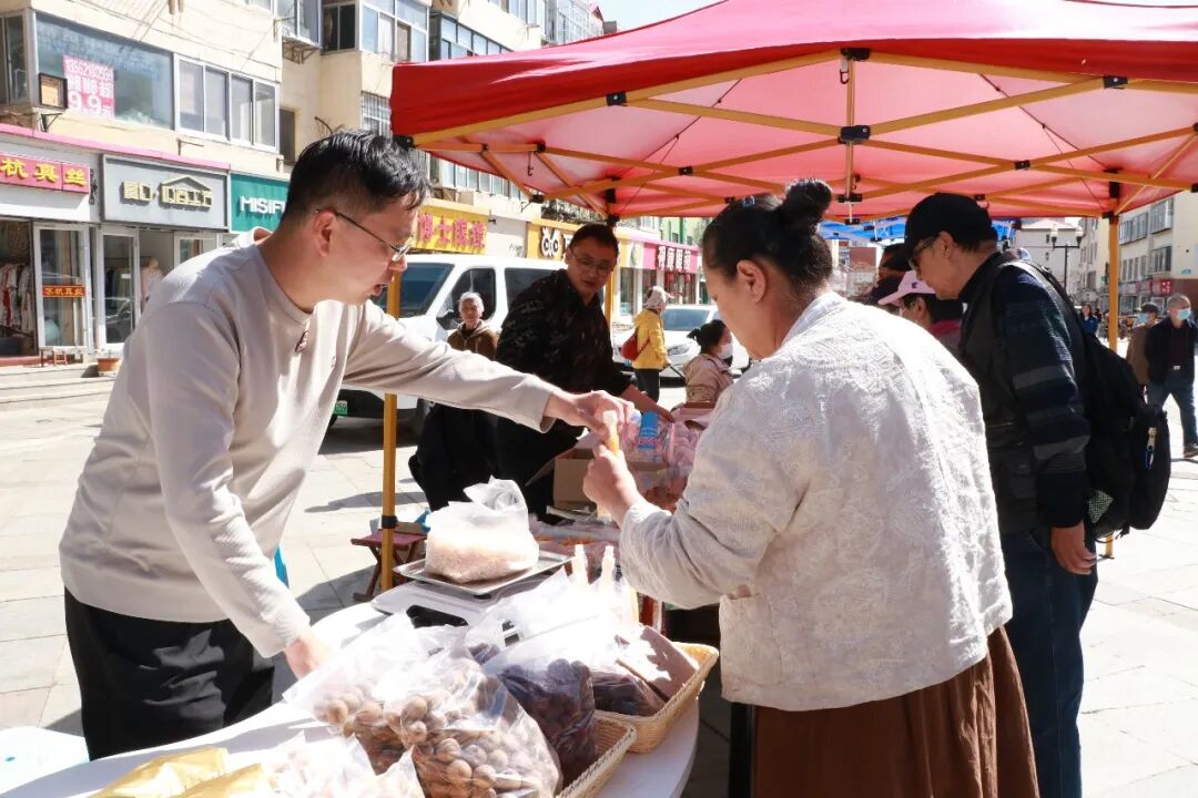 舞台之下,集市热闹非凡、暖意融融。公益服务区里,义诊、法律咨询、公益理发、磨刀贴膜、小修小补等便民服务一字排开,工作人员热情引导,将贴心服务送到家门口;政策宣传区中,共建单位化身“一日书记”,耐心答疑解惑、收集民生需求;非遗展示区、文创手作区里,精致非遗作品、威海特色文创琳琅满目;品牌售卖区新鲜果蔬、特色美食香气四溢,吸引不少居民驻足挑选。整场市集上,邻里相聚、欢笑不断,大家在互动中拉近距离、增进情谊,真正实现了“以市集聚人气,以互动暖人心”。