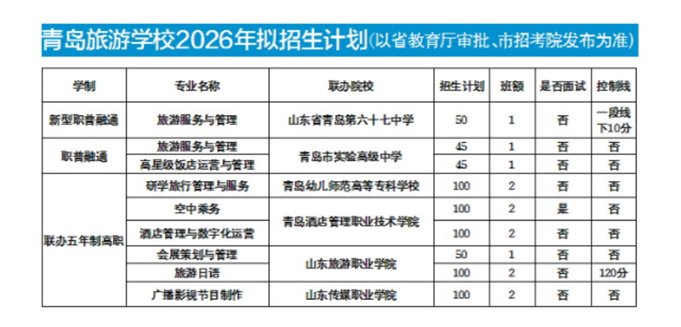 目前,青岛旅游学校有联办五年制高职、新型职普融通实验班、职普融通实验班等办学模式,开办旅游服务与管理、高星级饭店运营与管理、研学旅行管理与服务、酒店管理与数字化运营、空中乘务、旅游日语、会展策划与管理和广播影视节目制作等专业。其中,高星级饭店运营与管理专业被评为全国职业院校旅游类示范专业点,旅游服务与管理专业和高星级饭店运营与管理专业是山东省品牌专业,空中乘务专业是青岛市骨干专业。