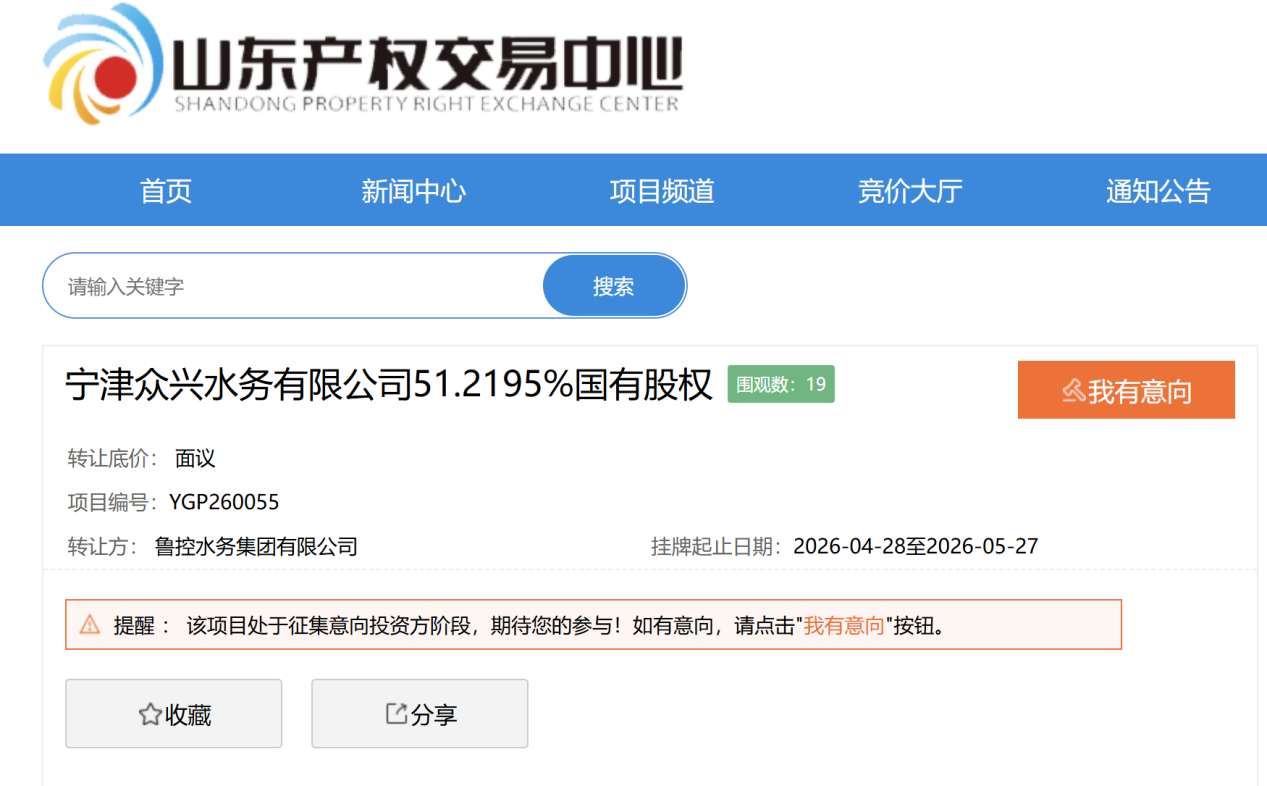 4月27日,山东产权交易中心发布产权转让预披露公告,鲁控水务集团有限公司(下称“鲁控水务”)拟挂牌转让所持宁津众兴水务有限公司(下称“宁津众兴水务”)51.2195%国有股权。本次挂牌起止日期为4月28日至5月27日,转让底价采取面议方式确定。交易完成后,宁津众兴水务实际控制权将发生转移。