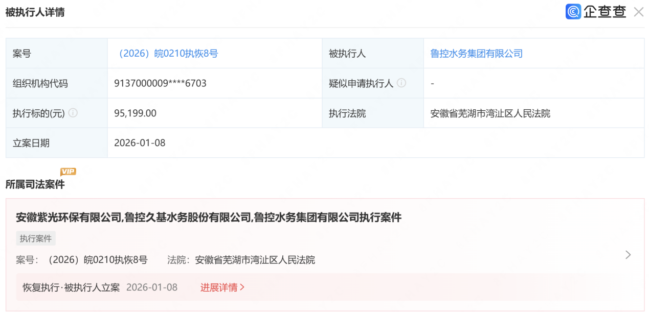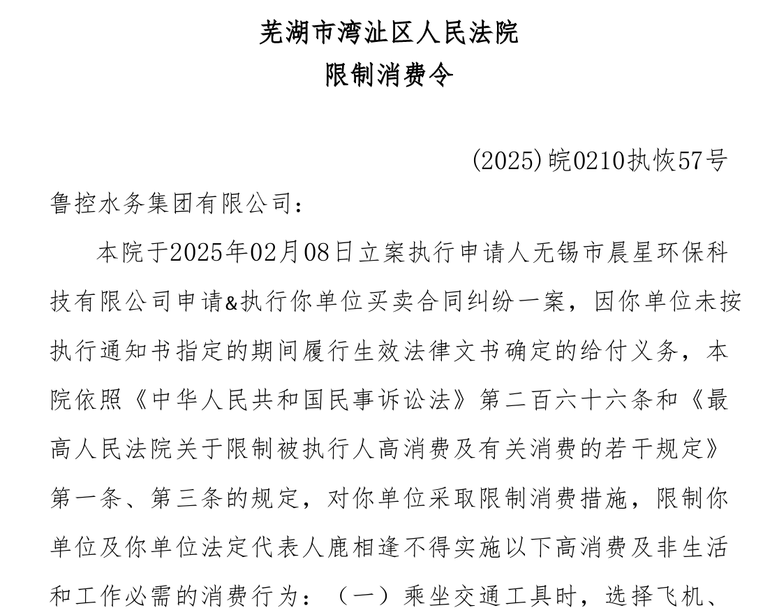 值得注意的是,2026年1月8日,鲁控水务被列入被执行人名单,执行标的为95199元;2025年12月31日,因买卖合同纠纷案件,该公司被法院采取限制高消费措施,同时其法定代表人鹿相逢也同步被限制高消费。