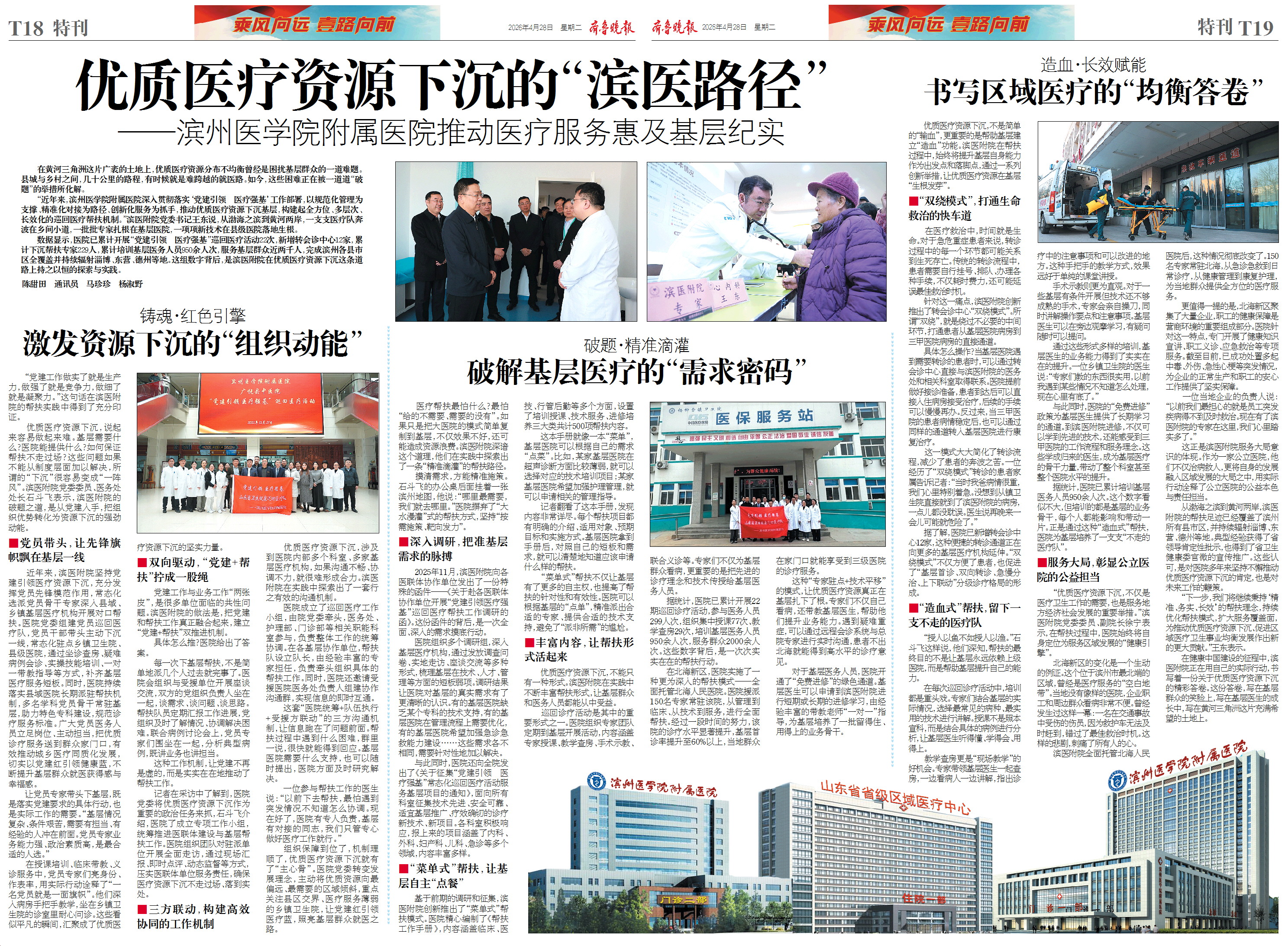 “近年来,滨医附院深入贯彻落实‘党建引领医疗强基’工作部署,以规范化管理为支撑、精准化对接为路径、创新化服务为抓手,推动优质医疗资源下沉基层,构建起全方位、多层次、长效化的巡回医疗帮扶机制。”滨医附院党委书记王东说,从渤海之滨到黄河两岸,一支支医疗队奔波在乡间小道,一批批专家扎根在基层医院,一项项新技术在县级医院落地生根。