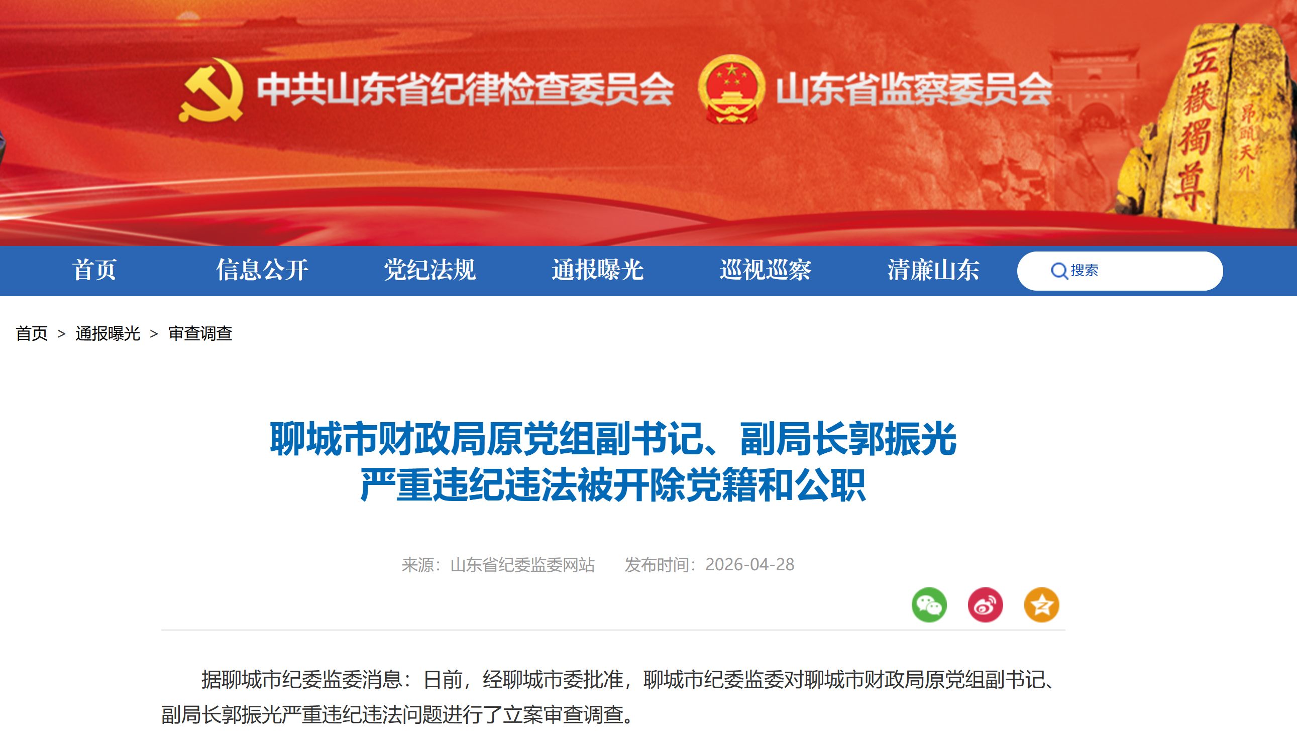 山东省纪委监委网站4月28日消息,聊城市财政局原党组副书记、副局长郭振光被开除党籍和公职。