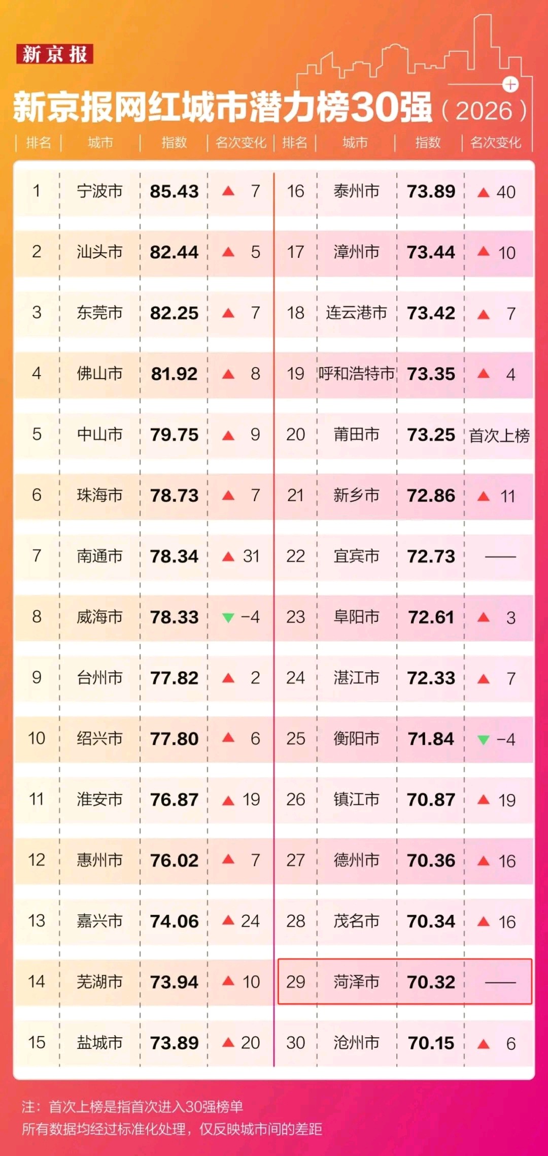 日前,新京智库发布的《2026新京报网红城市潜力报告》给出了一个风向标式的预测。在其揭晓的“网红城市潜力榜”30强名单中,山东菏泽的名字赫然在列。