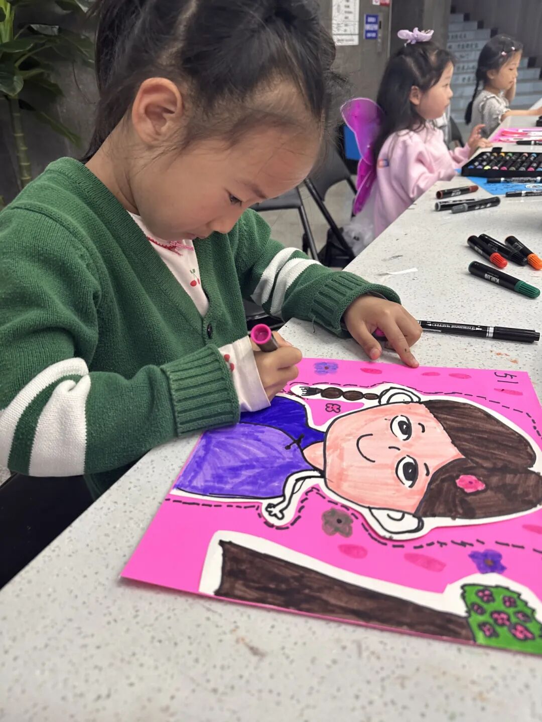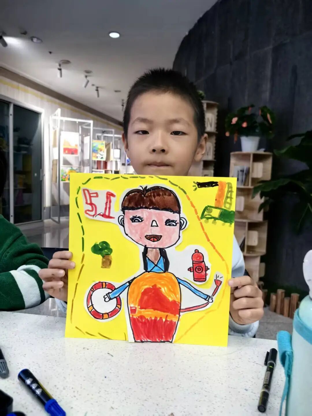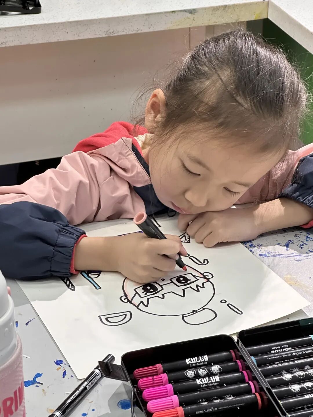 创作环节中,孩子们仔细观察不同职业的标志性特征——医生的白大褂与听诊器、消防员的头盔与水枪、环卫工的反光背心与扫帚……在老师指导下,他们大胆发挥创意,用画笔生动描绘心中的英雄。有的画出警察叔叔执勤的英姿,有的描绘医生阿姨问诊的温柔侧脸,童真笔触间流露出最纯粹的爱与敬意。