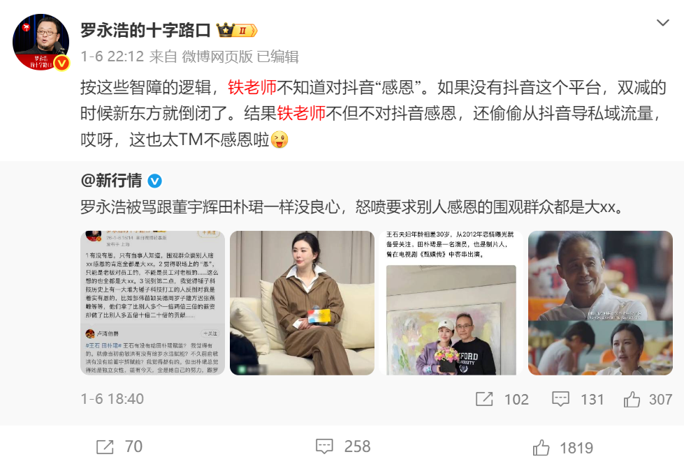 对此,有网友表示:“任何一个人遭遇罗永浩、董宇辉这种忘恩负义的小人都够呛。”随后,罗永浩发文怒怼该言论:“协商解除劳动合同后走人也不行?这也能叫忘恩负义?难道他们要一辈子给铁老师做牛做马才行”。据悉,罗永浩于2001年成为北京新东方学校的任课教师,2006年离职,离职后长期称俞敏洪为“铁公鸡”、“铁老师”。