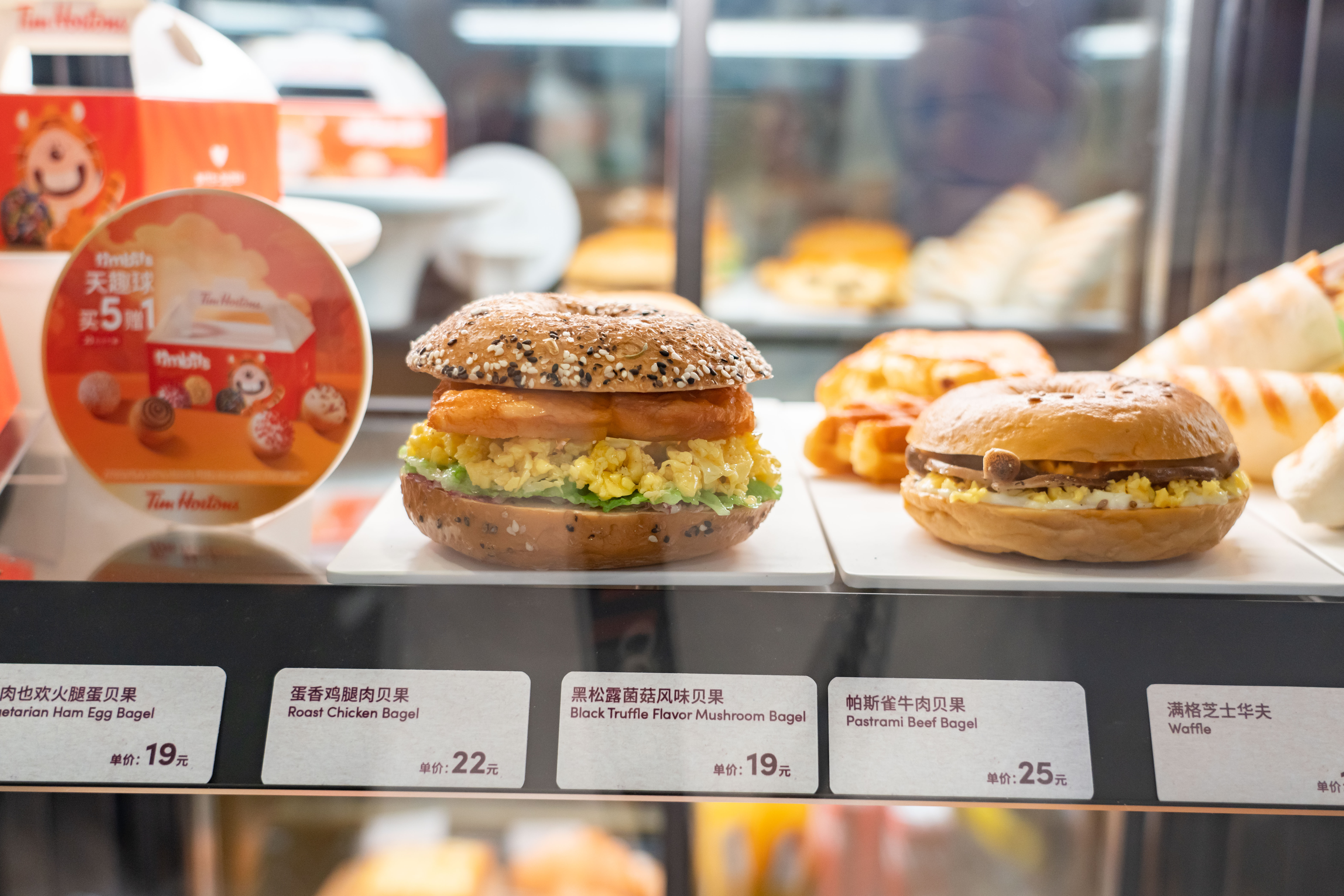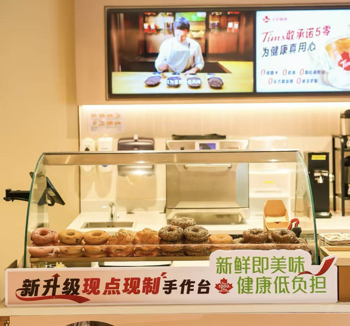 所谓“现制店”,即区别于传统的模式,消费者到店点单后食物即时现场制作,尤其是Tims咖啡主打的贝果、贝果堡等暖食。这一转型启动于2024年,当时的Tims咖啡在店里开始新增手作柜台,消费者点单后,由店员现场添加辅料。