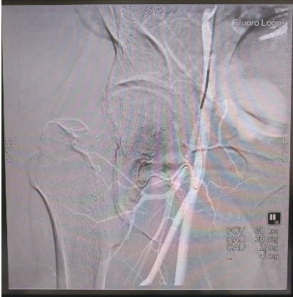 患者为一名42岁中年男性,确诊双侧股骨头坏死近3个月,曾就诊奔波市内多家医院进行康复理疗,效果不佳。入住济南市五院后得知医院开展的这一介入治疗技术,患者和家属治疗意愿特别强烈。考虑患者年龄、病情进展情况,经介入科与骨一科术前评估、会诊协商后决定尽快为患者实施股骨头供血动脉溶栓+灌注融通术。
