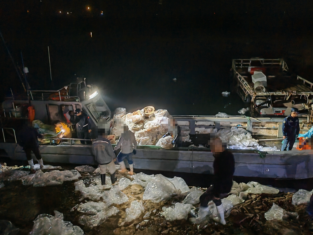 当日,该局根据情报线索获悉,辖区有走私活动,随即紧前部署警力,实地蹲守摸排。凌晨0时许,海警执法员在烟台海阳某码头现场查获涉案快艇1艘、货车2辆、看水车5辆,抓获犯罪嫌疑人16名,查扣鲜活松叶蟹、红毛蟹1万余斤,案值超100余万元。案发后,该局集中执法骨干力量,全面依法依规取证,稳步推进案件办理。