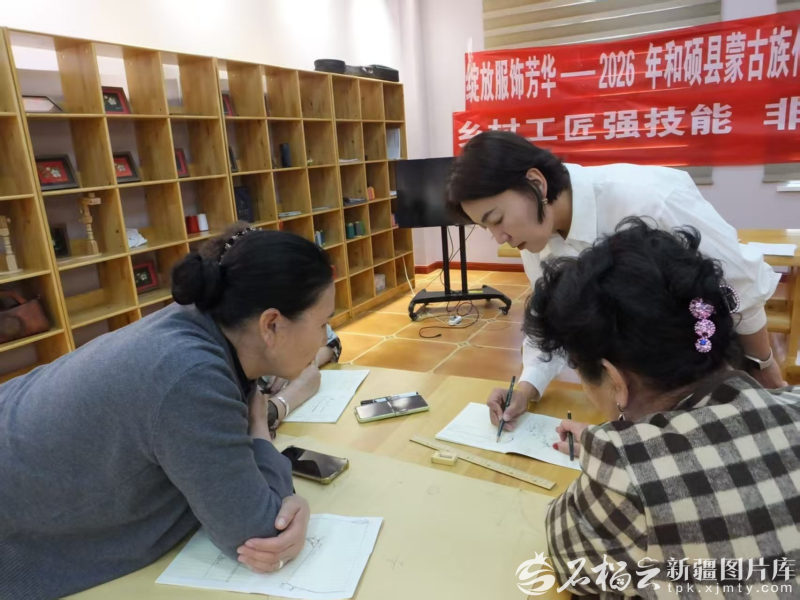 艾尔代尼才次克(中)在教培训班学员画服装设计稿。本人供图