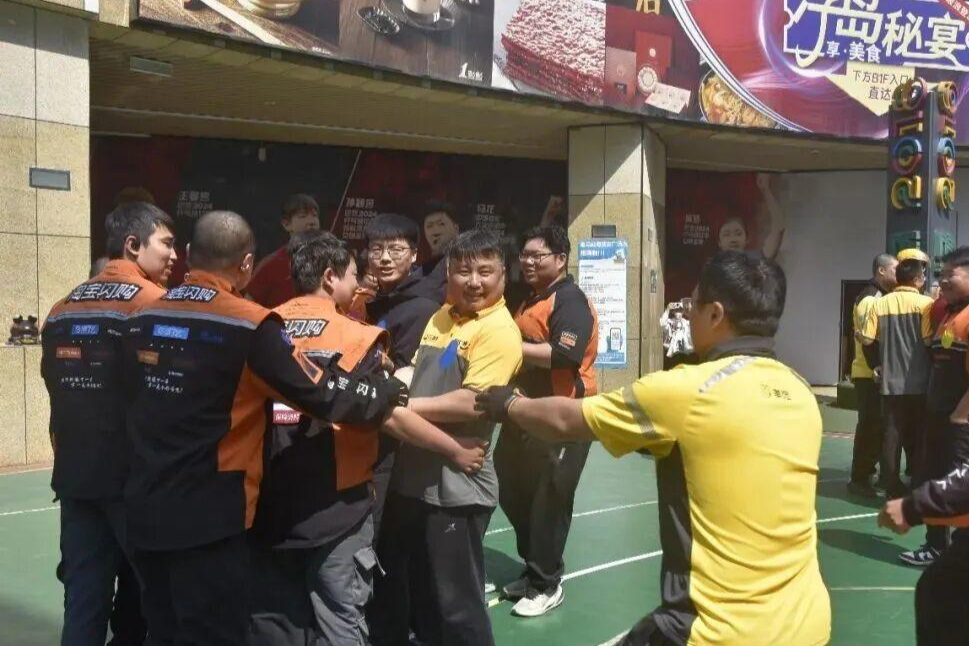 近日,环翠楼街道在威高广场北下沉广场,举办新就业群体趣味运动会。美团、淘宝闪购、京东、顺丰、盒马鲜生及快递行业协会等平台 80 余名快递小哥、外卖骑手齐聚一堂,在运动中放松身心、增进情谊。