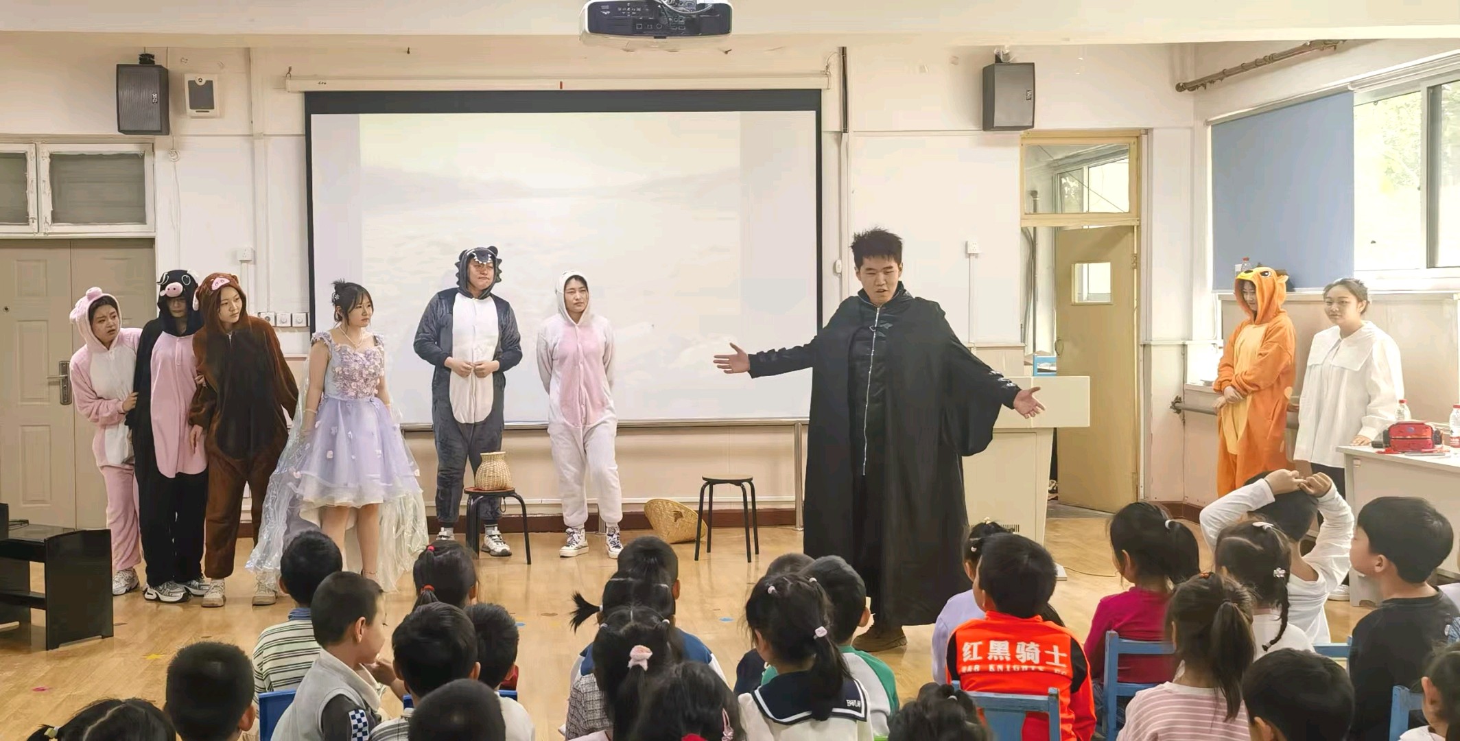 伴随法制节目开场音乐,“小鹿主持人”拉开序幕:猪家庄草屋倒塌、猪大哥失踪,大灰狼因爪上血迹被冤告上法庭……孩子们的情绪随剧情起伏——有的为大灰狼红了眼眶,有的紧张地跟随“小证人”探寻真相。当黄小轩与水精灵点亮正义灯笼,揭露黑魔王利用垃圾污染黄河的真相时,现场惊呼四起;而当小动物们齐心协力击败黑魔王、黄河恢复清澈时,更是爆发出热烈的掌声与欢呼。互动环节中,孩子们成为推动剧情的一员,演出尾声的全场欢乐舞动,将现场汇成一片童真的海洋。