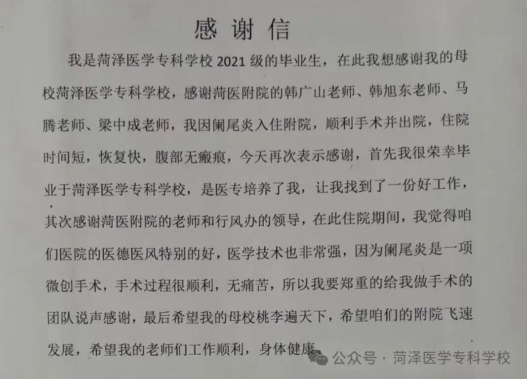 最近,一封特别的感谢信,在菏泽医学专科学校的校友圈里悄悄传开了。写信的是一位2021届的年轻毕业生,而她感谢的对象,正是母校的附属医院——菏泽医专附属医院普外科的老师们。