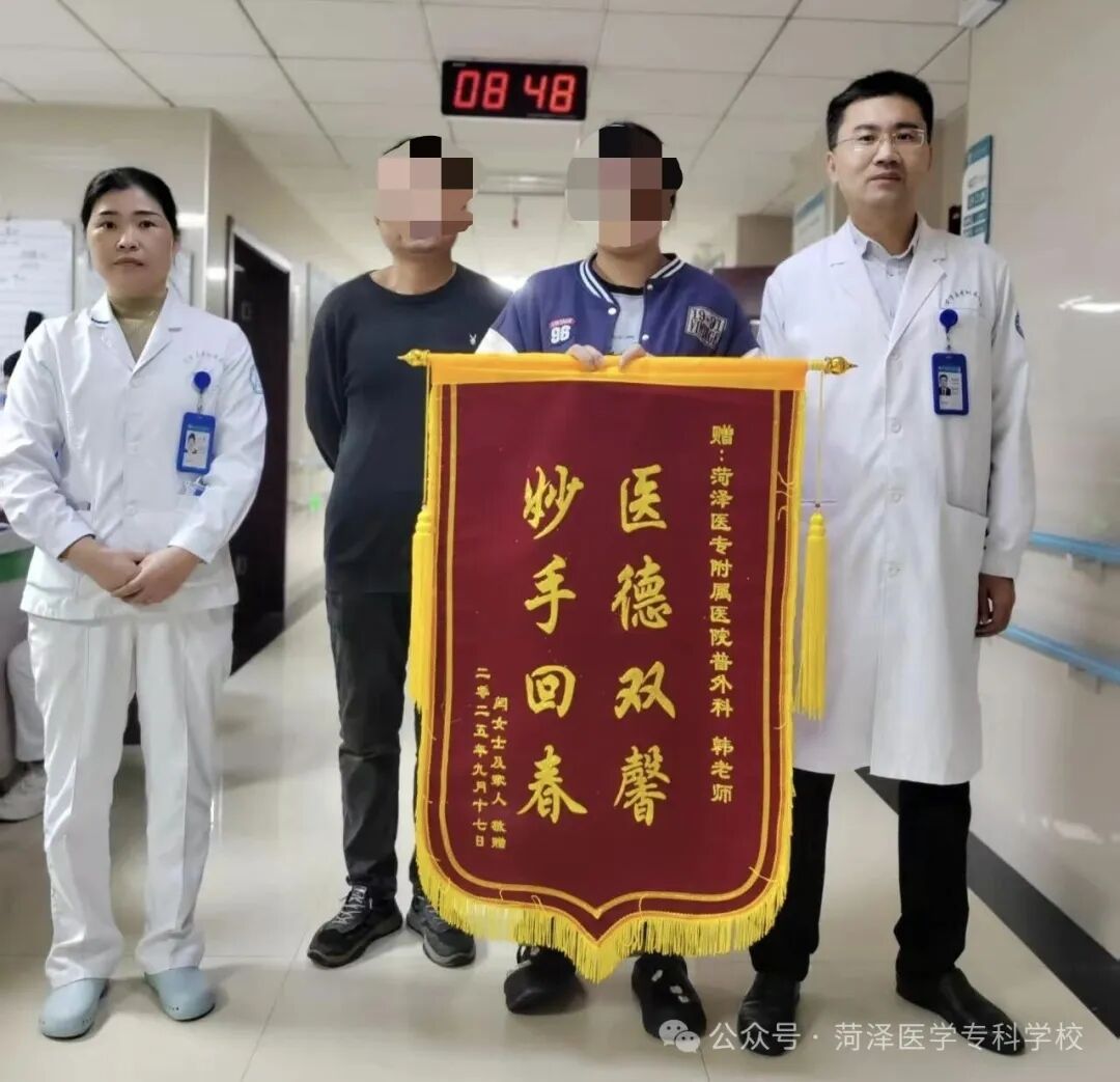 “是菏泽医专培养了我,让我找到了一份好工作。”患者这句朴实的话,道出了无数菏医学子的心声。她从母校课堂汲取知识,在附属医院实习锤炼本领,如今又在这里获得救治。她为老师们送上的锦旗——“医德双馨,妙手回春”,正是对师恩与医者仁心最真挚的致敬。