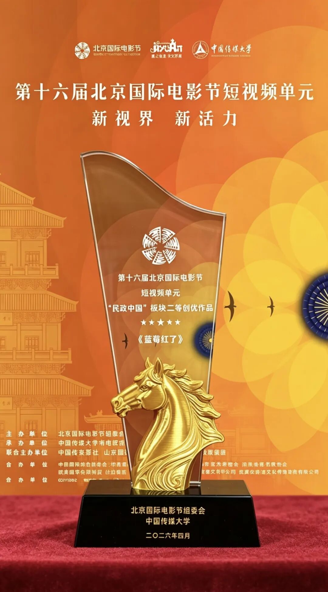 4月23日,第十六届北京国际电影节短视频单元荣誉盛典在河南省济源市隆重举办。由山东省福利彩票发行中心、山东省互联网传媒集团联合策划出品的微电影《蓝莓红了》获得“民政中国”板块二等创优作品荣誉。