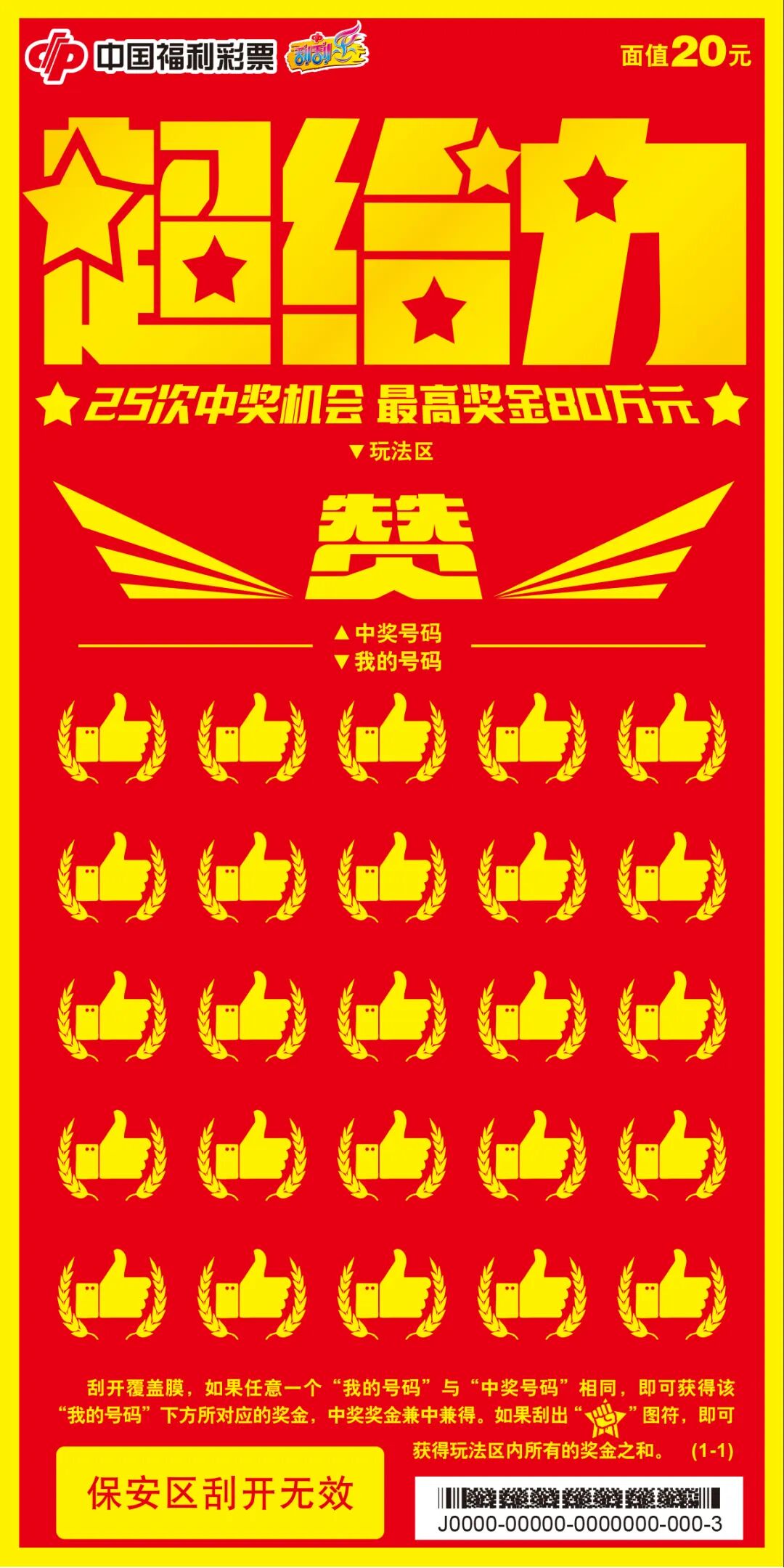 红金配色,大气有力;一张彩票,一份期待。今天为您介绍的是福彩刮刮乐“超给力”系列——20元面值,最高奖金80万元,玩法简单,一目了然。