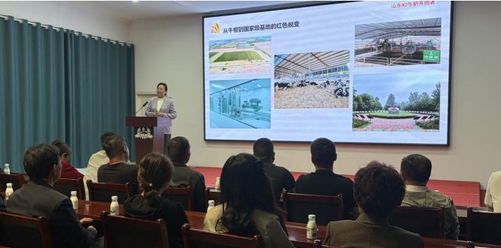 在牧场讲解员引导下,一行人实地参观牧场生产区、特色文化园区、铸牢中华民族共同体意识教育展馆、牛奶加工车间及党建文化阵地,近距离了解现代牧场运营管理、企业文化建设与民族团结进步创建融合实践,接受党性教育与民族团结教育熏陶。在党建广场,全体党员面向党旗重温入党誓词,誓言铿锵有力,进一步坚定初心使命、凝聚奋进合力。