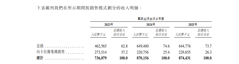值得一提的是,卡拉罗中国存在客户集中度较高的风险。在2023年、2024年及2025年,公司向前五大客户的销售额分别占总收入的74.8%、73.7%及68.4%;其中,最大单一客户为卡拉罗集团,公司向卡拉罗集团的销售额分别占2023年、2024年及2025年总收入的37.2%、25.4%及26.3%。